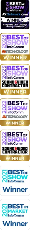 Vanguard offers the broadest range of leading-edge indoor and outdoor LED displays. These include very fine pixel pitches starting at P0.6, Chip On Board, Epoxy Resin, XR Studio, All-In- One, Transparent, Roll-Up Displays, Flex, 3D, and the ground-breaking Infinity Control System.