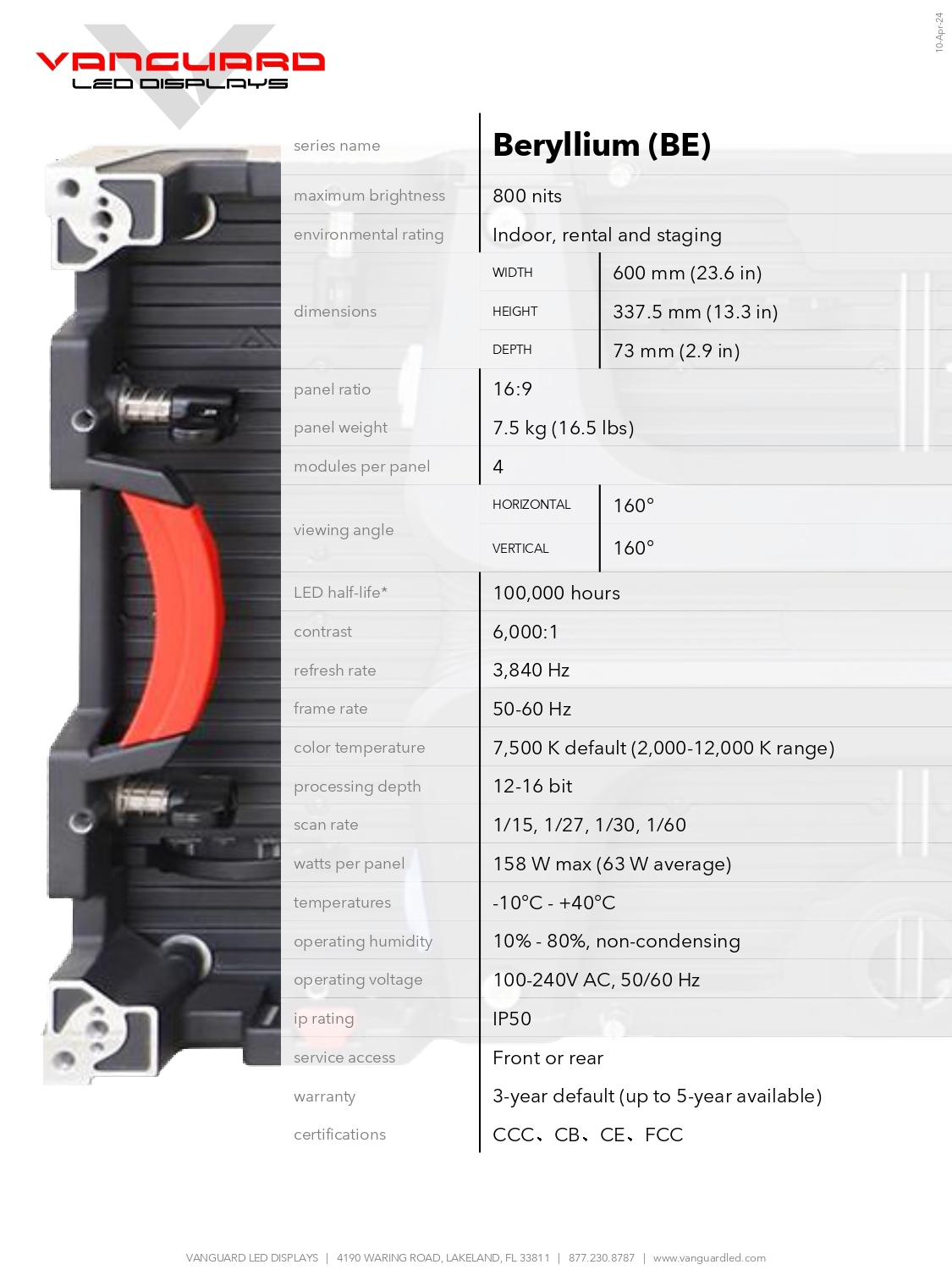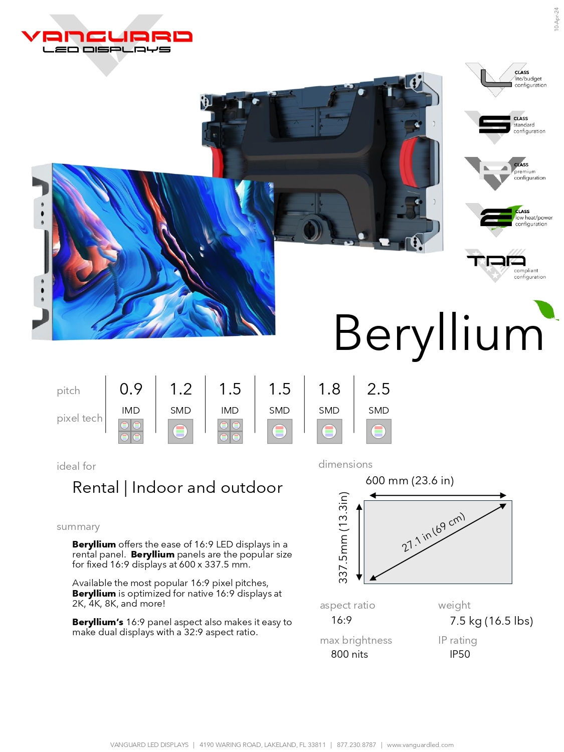 Beryllium offers the ease of 16:9 LED displays in a rental panel. Beryllium panels are the popular size for fixed 16:9 displays at 600 x 337.5 mm.