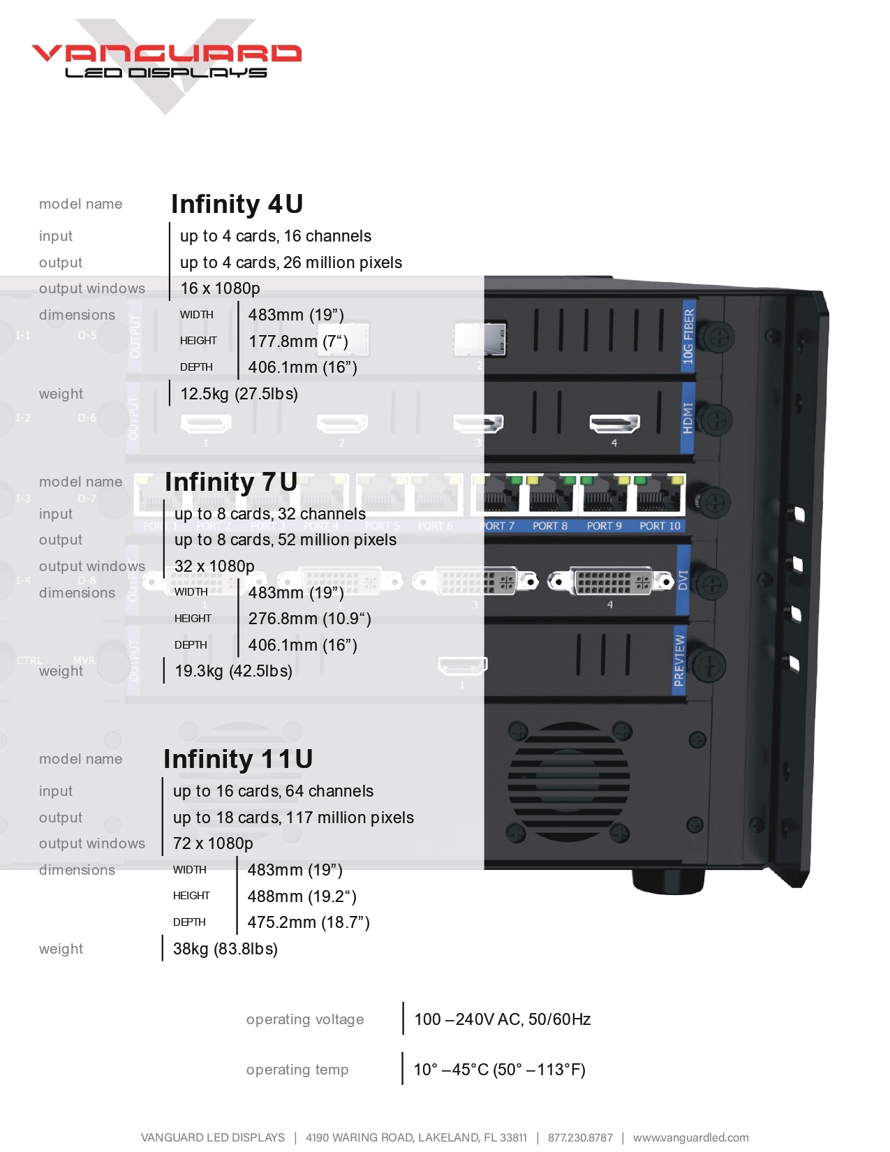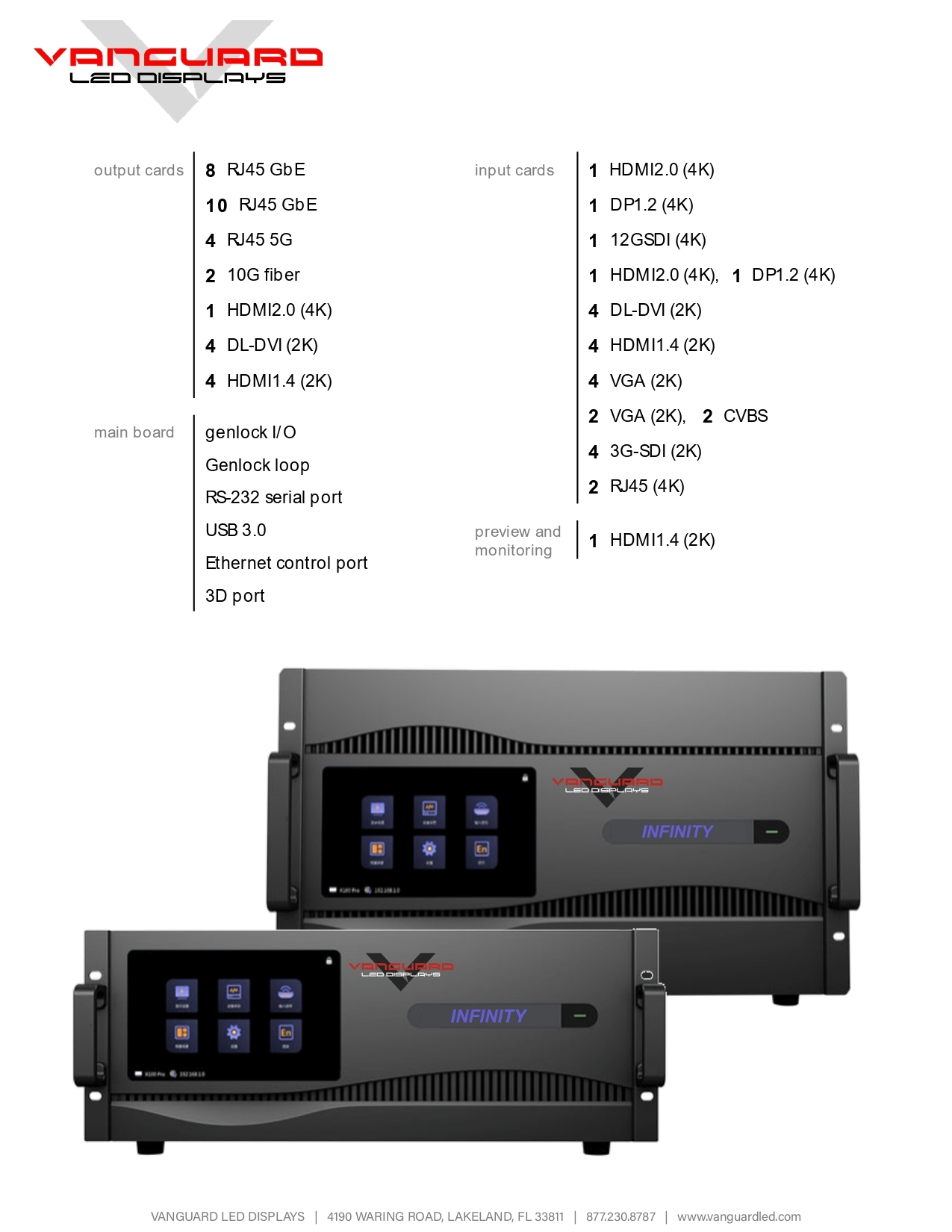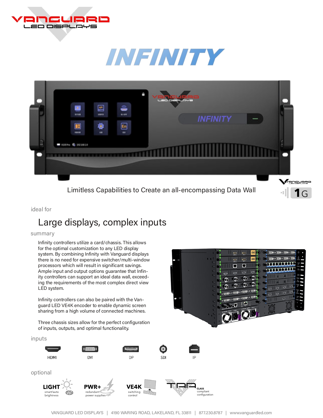 Infinity controllers utilize a card/chassis. This allows for the optimal customization to any LED display system. By combining Infinity with Vanguard displays there is no need for expensive switcher/multi-window processors which will result in significant savings.